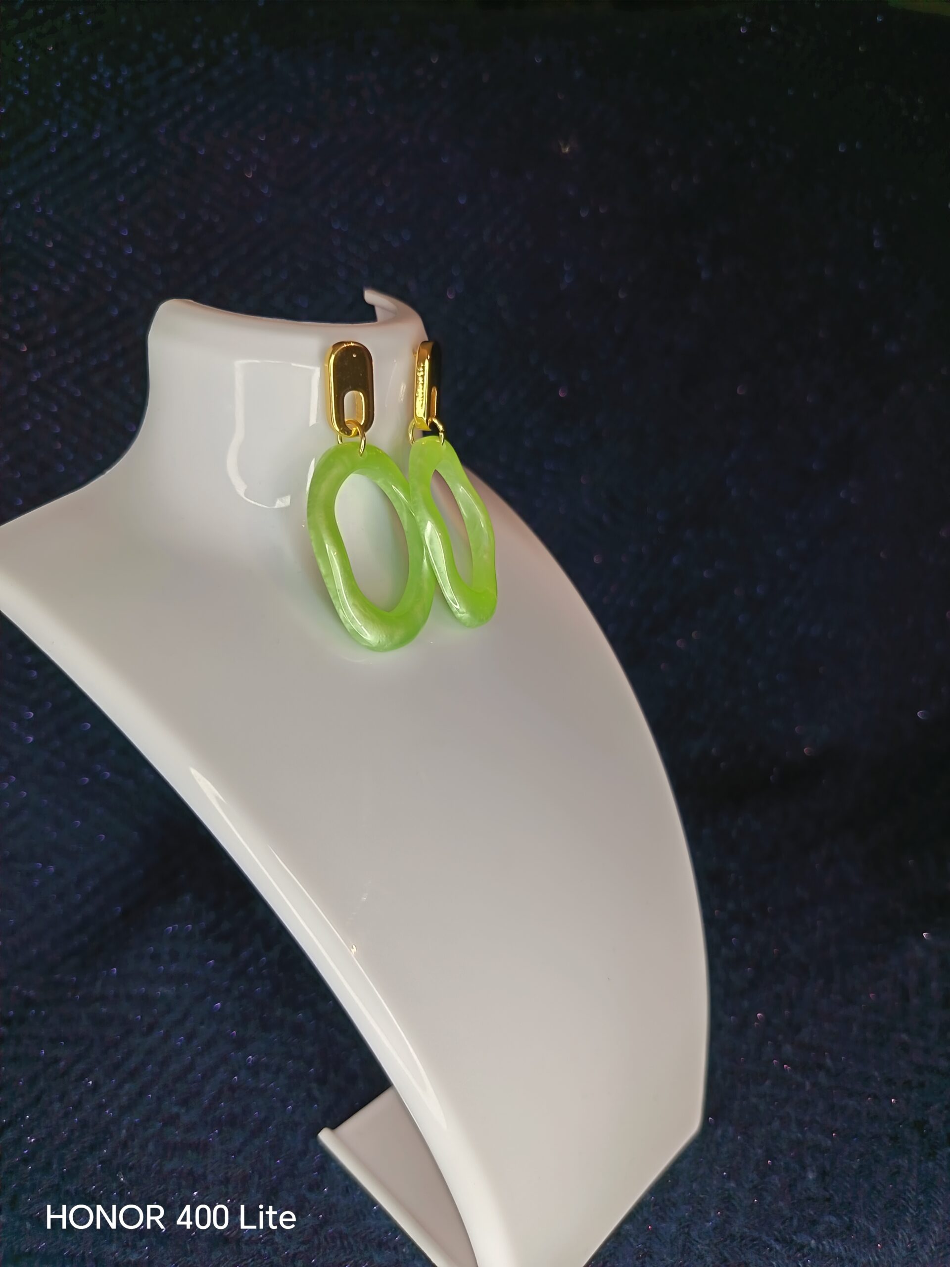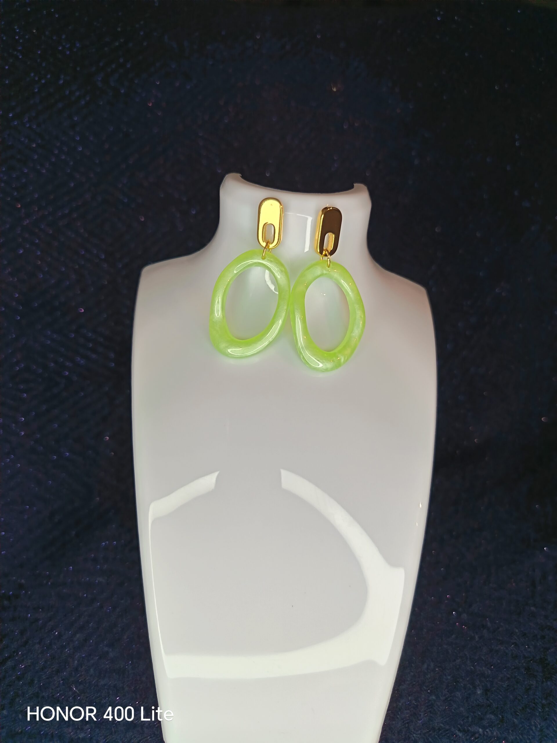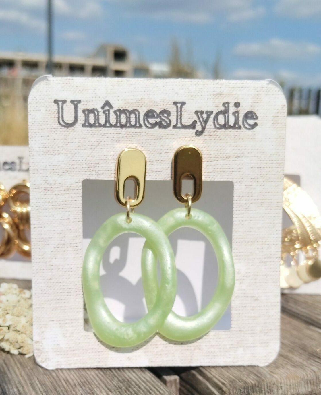Boucles d’oreilles Alcyone – Base dorée en acier inoxydable, sublimée par un pendentif en résine formant un anneau d’un vert jade élégant.