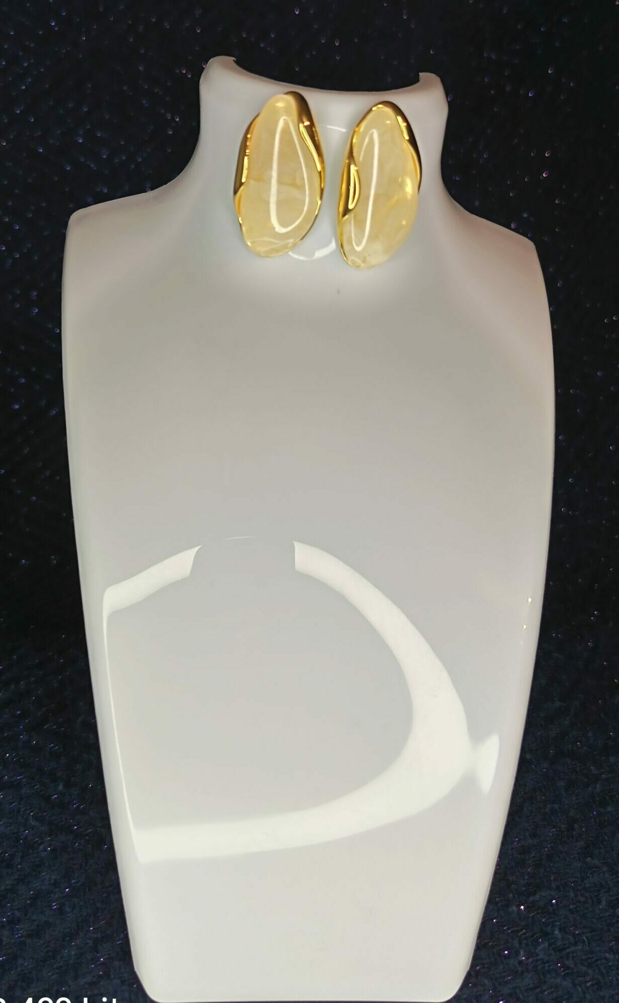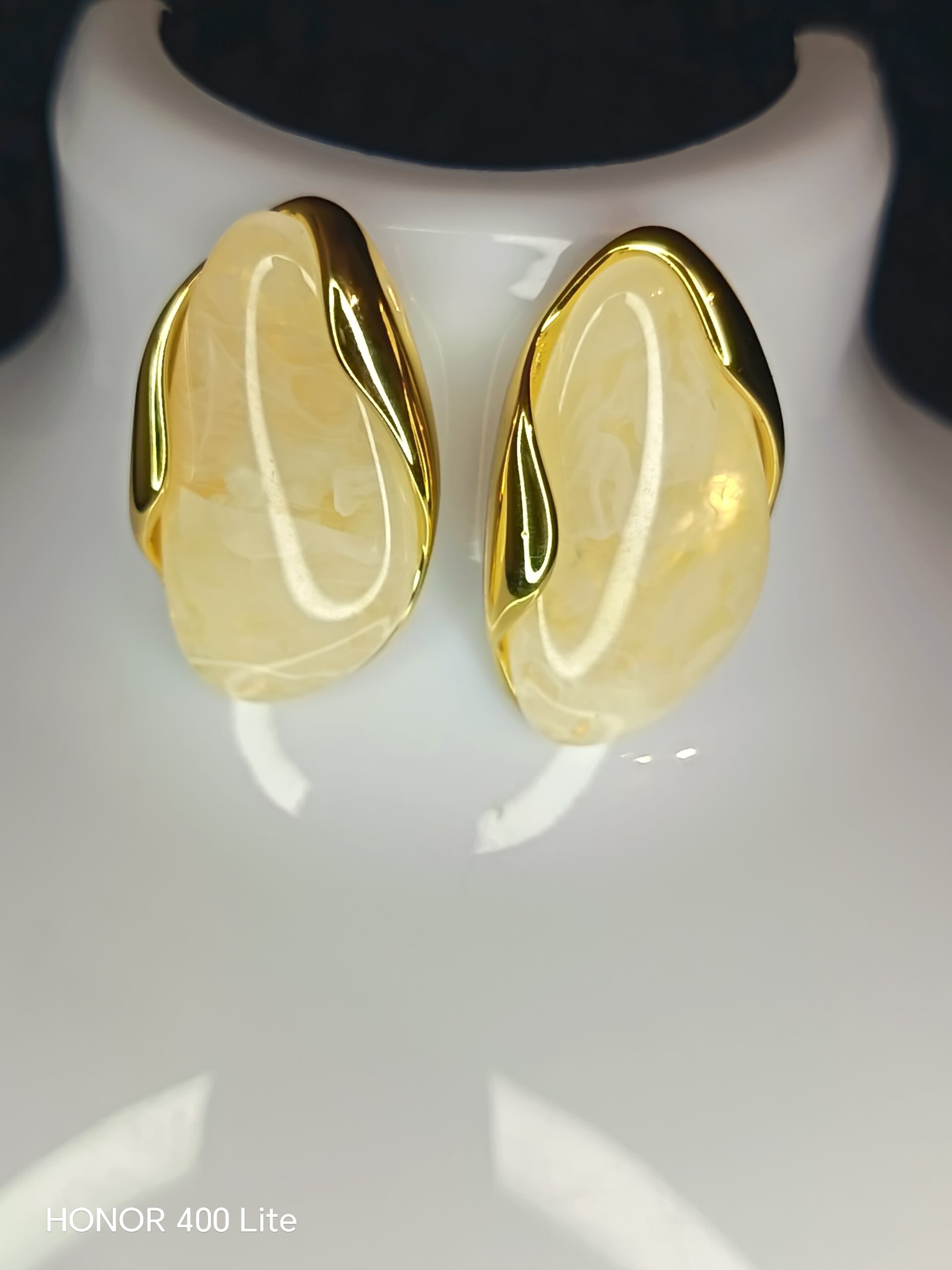 Boucles d’oreilles Andromède – dorées, ornées d’un cabochon en verre marbré beige.