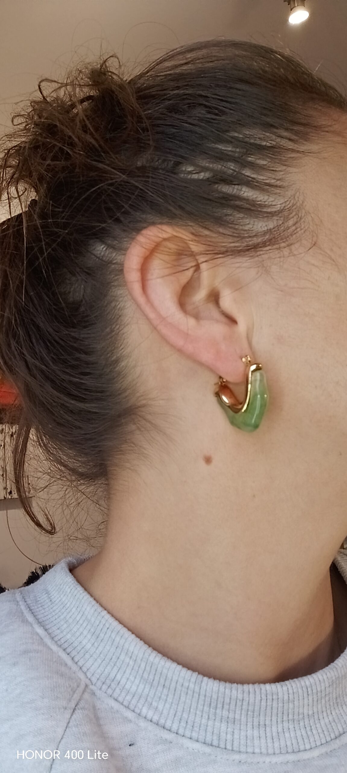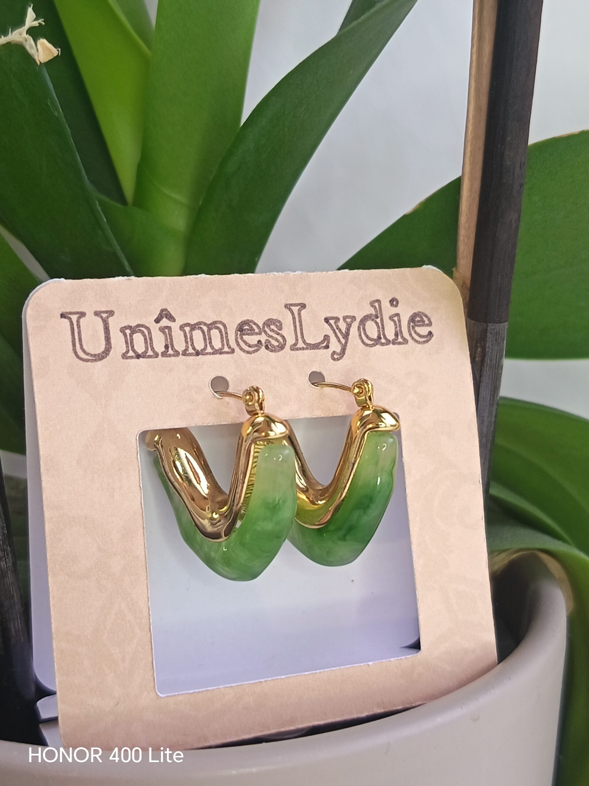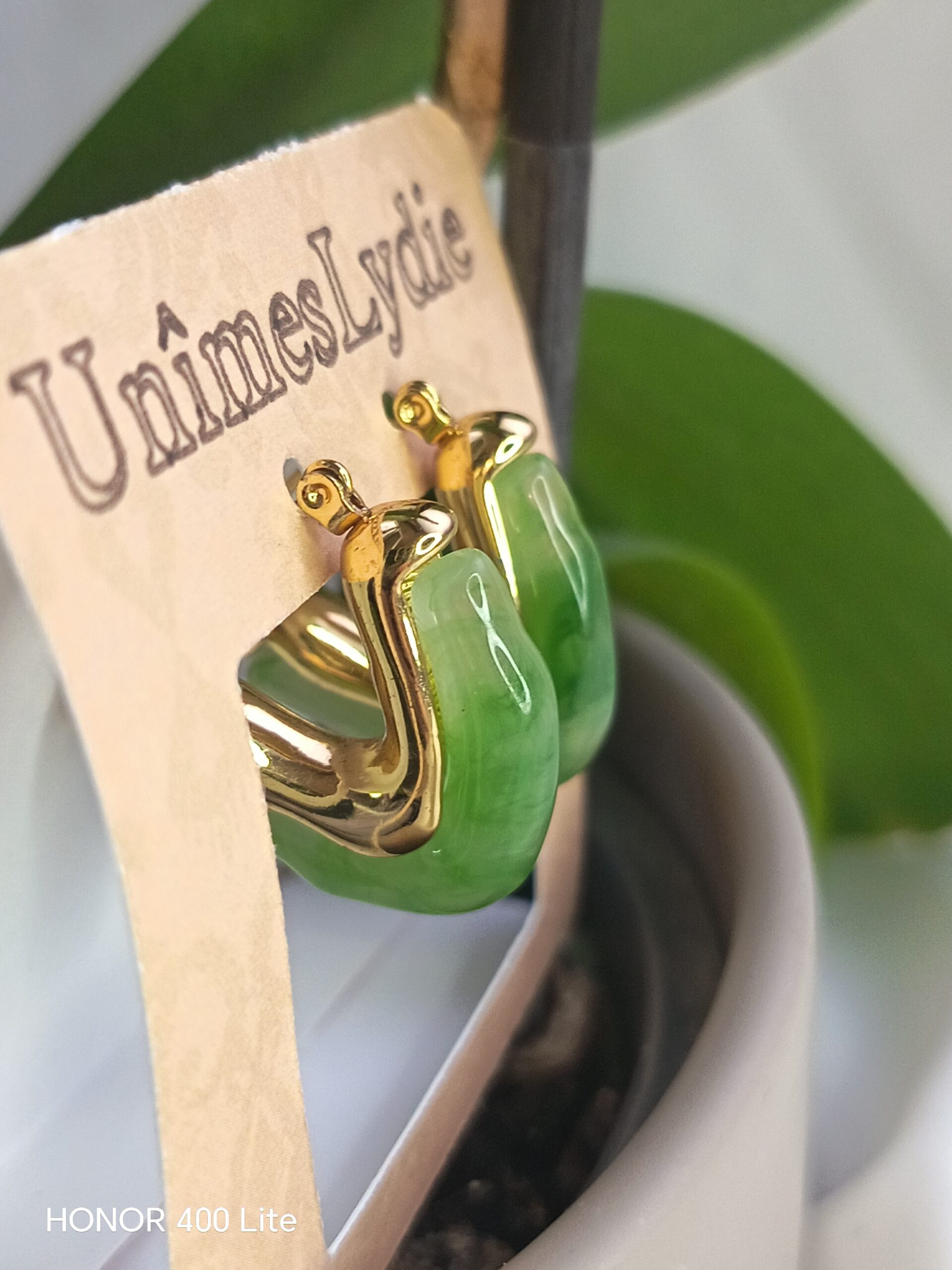 Les boucles d’oreilles GAÏA associent un pendant vert translucide aux nuances marbrées à une monture dorée en acier inoxydable.