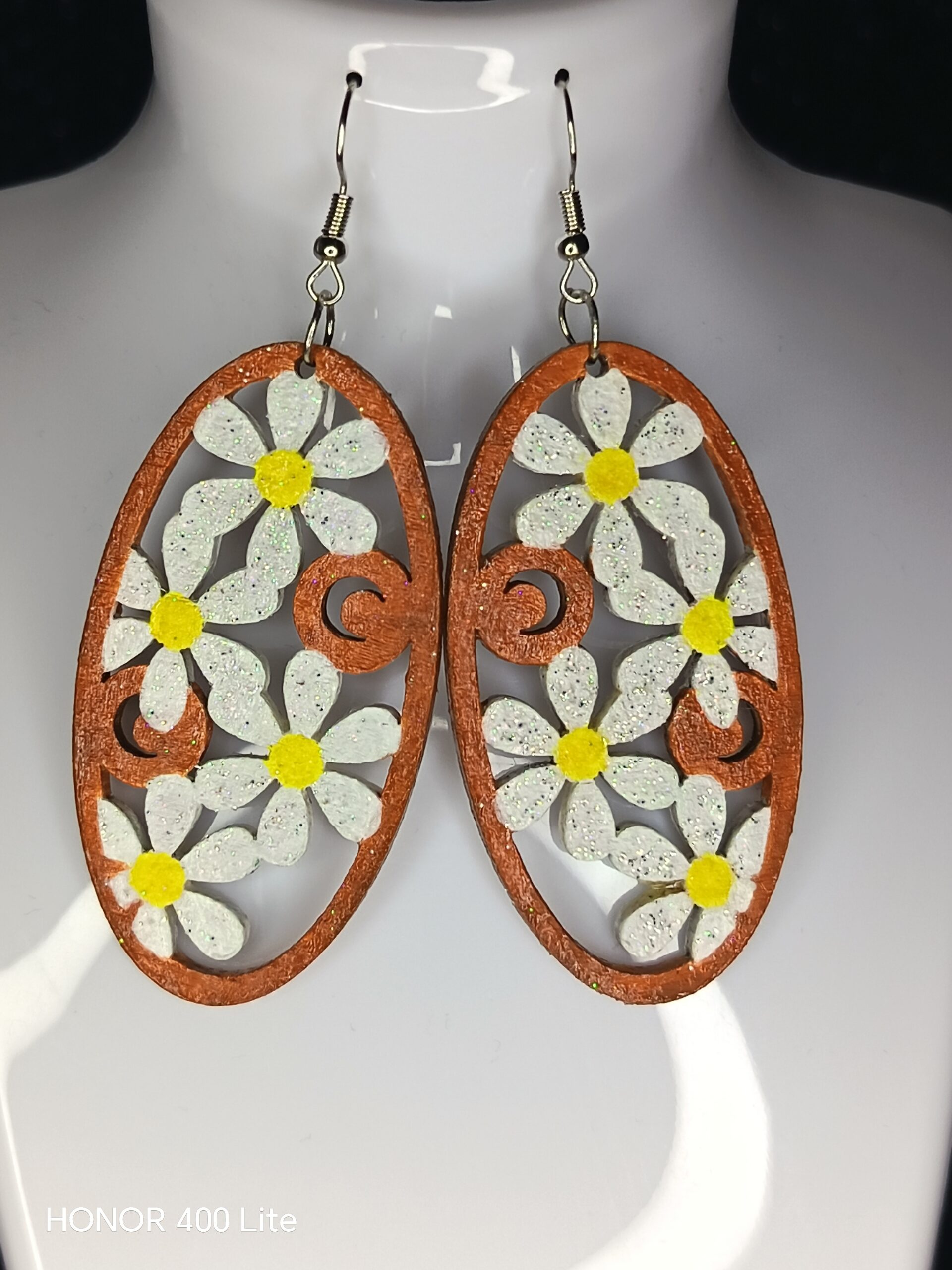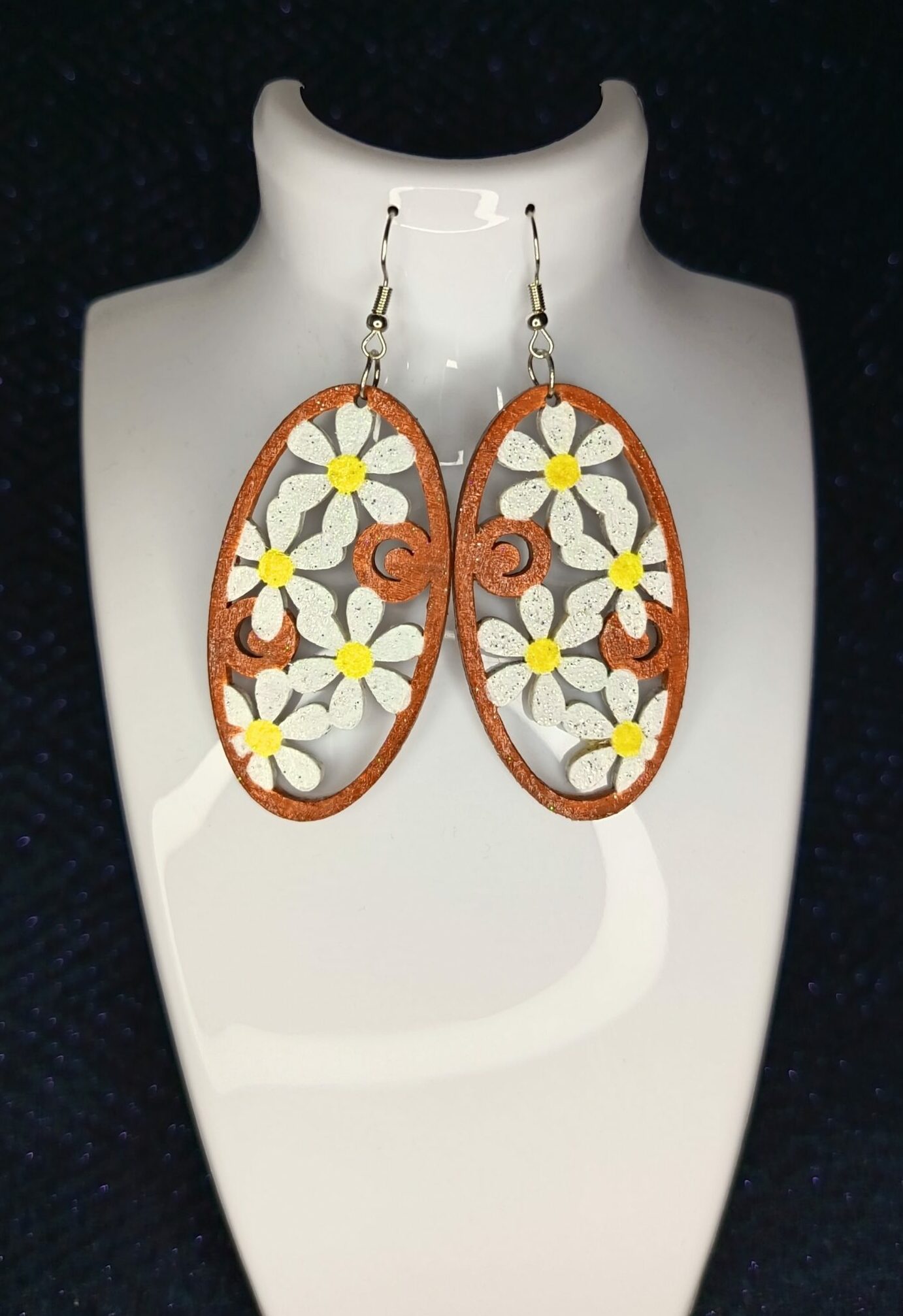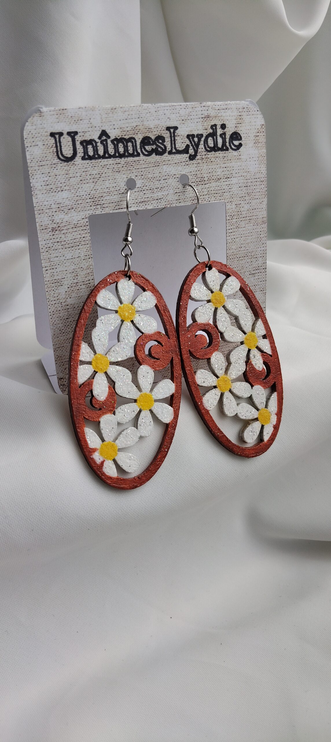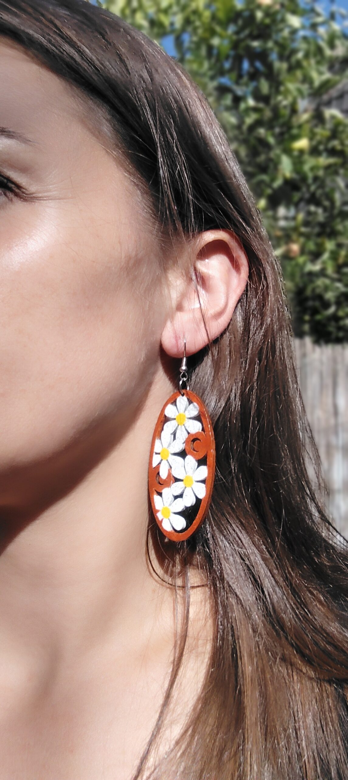 Boucles d’oreilles Marguerite – modèle unique en bois peint à la main.