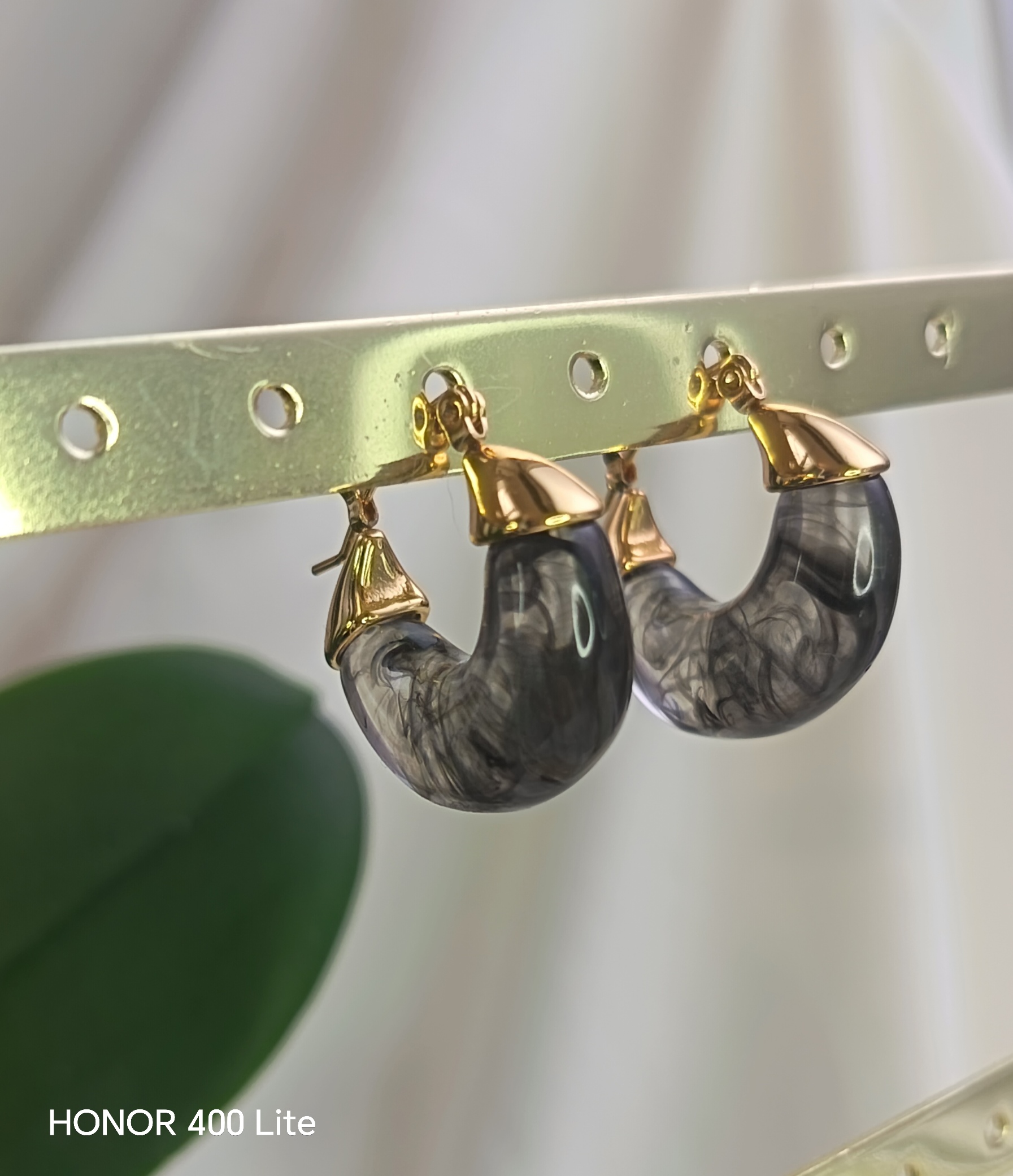 Les boucles d’oreilles Nebula sont en verre marbré noir et transparent, montées sur de l’acier inoxydable doré.