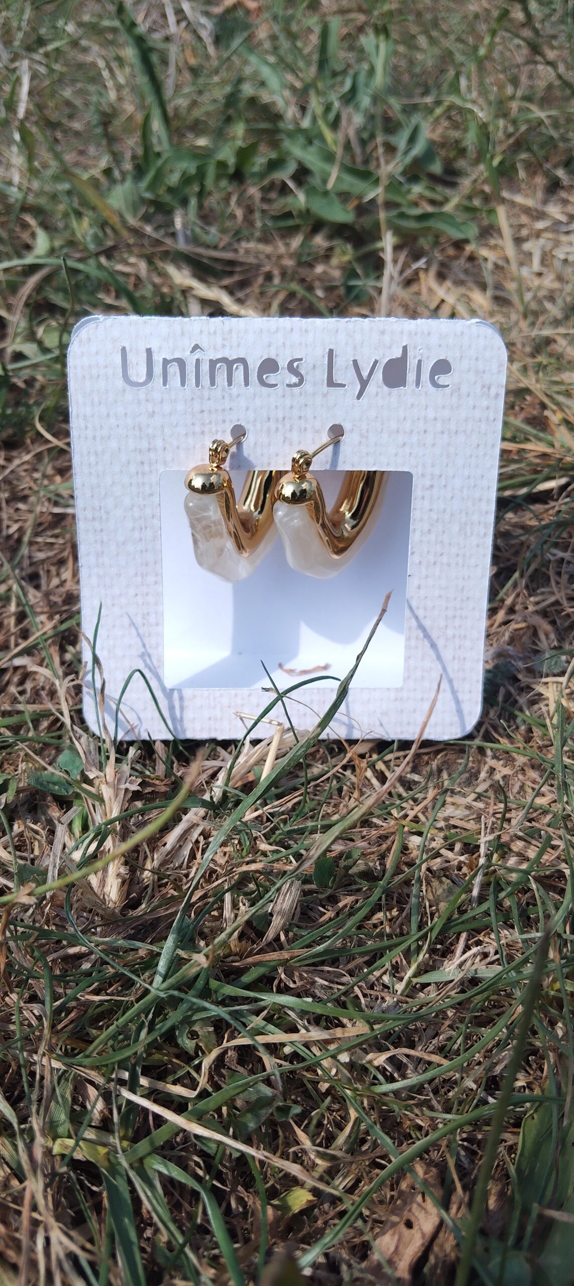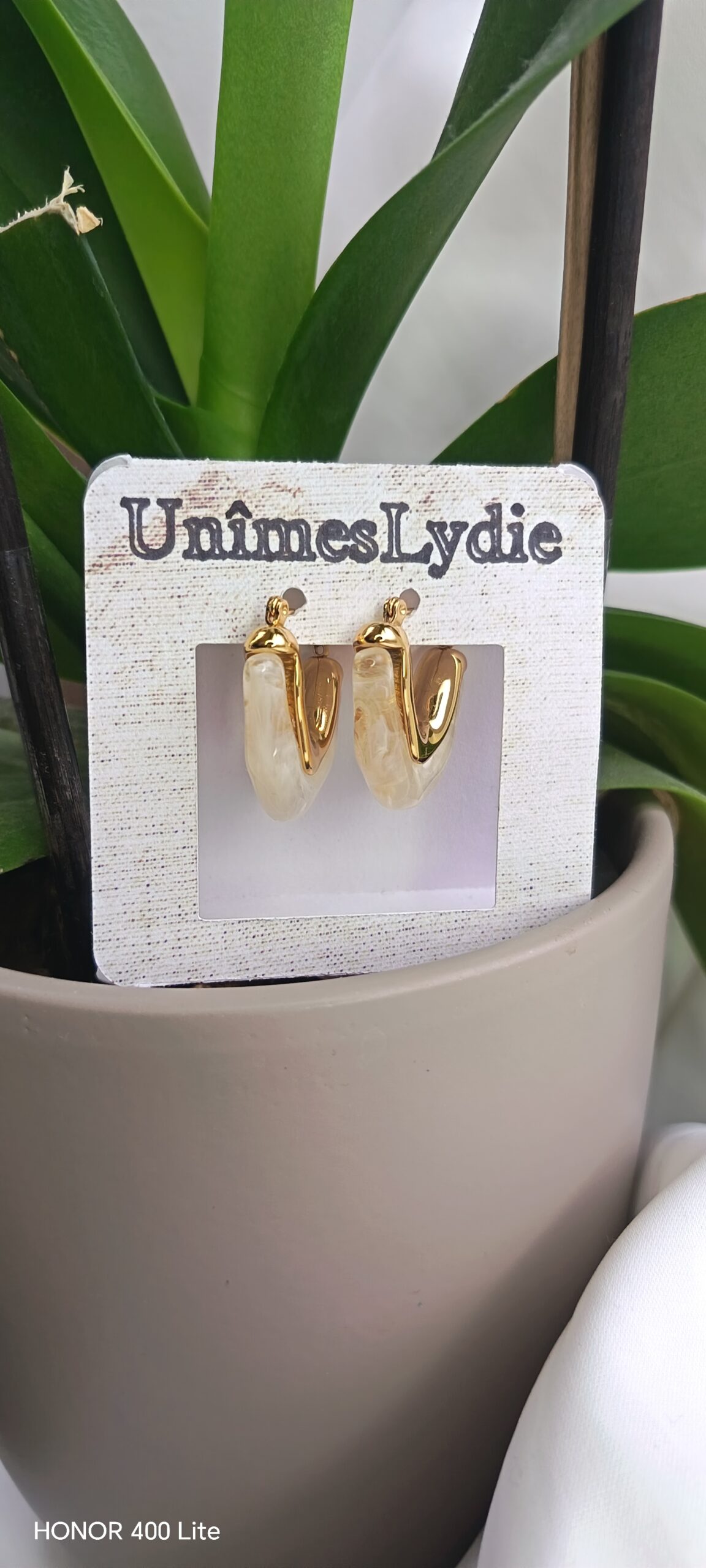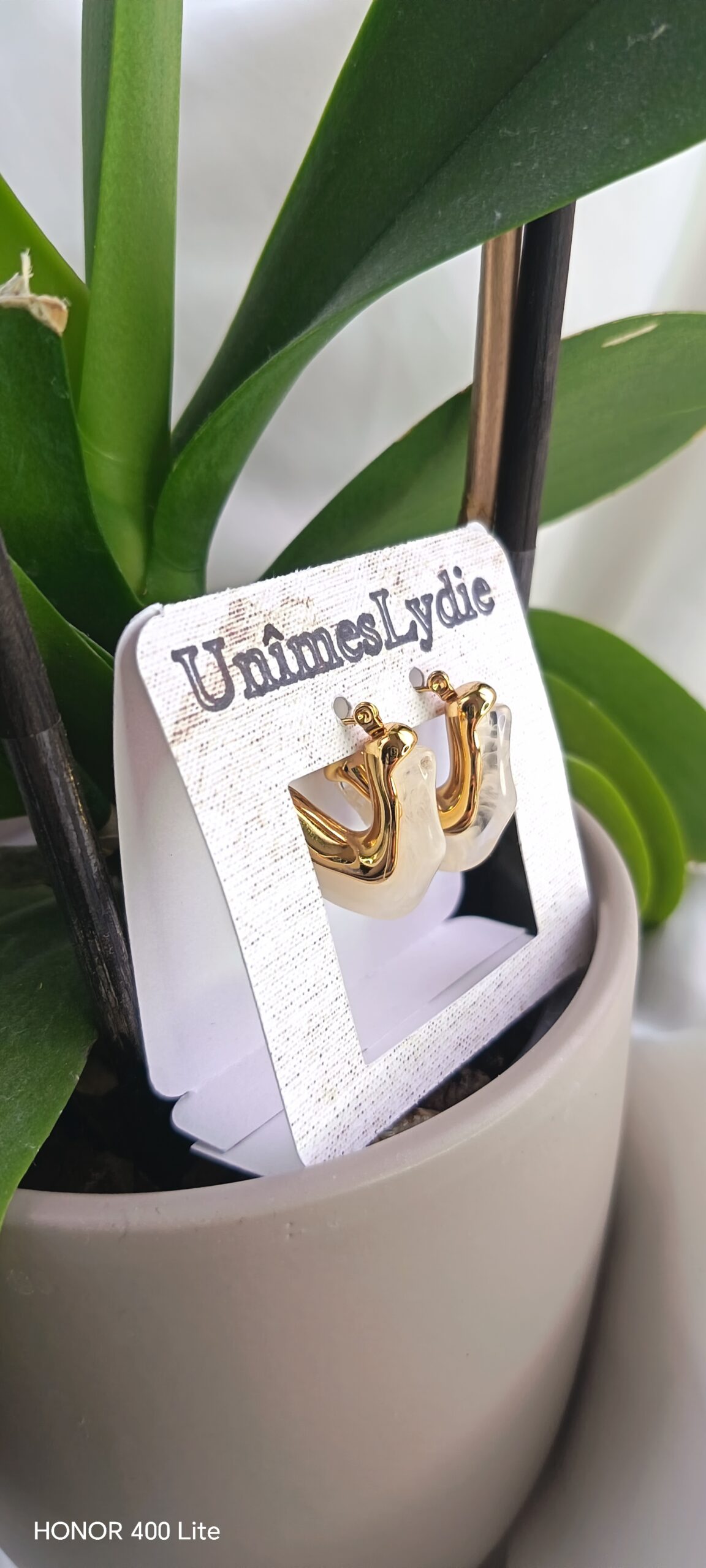 Les boucles d’oreilles Syrma se distinguent par un pendant blanc marbré aux reflets doux, associé à un support en acier inoxydable doré.